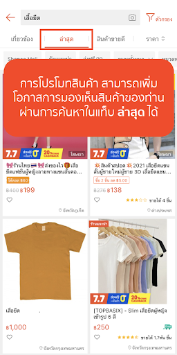 เมื่อร้านค้าใช้ฟังก์ชันโปรโมทสินค้า สินค้าจะได้รับการโปรโมทตามหมวดหมู่ในหน้าผลการค้นหาสินค้า โดยจะปรากฏให้เห็นเป็นลำดับต้นๆ ภายในแท็บ ล่าสุด