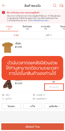 หลังจากที่ท่านเลือกโปรโมทสินค้าไปแล้ว 1 ชิ้น หากท่านต้องการที่จะโปรโมทสินค้าเดิม ท่านจำเป็นต้องรอให้การโปรโมทสินค้าดังกล่าวครบ 4 ชั่วโมง ถึงจะสามารถดำเนินการต่อได้