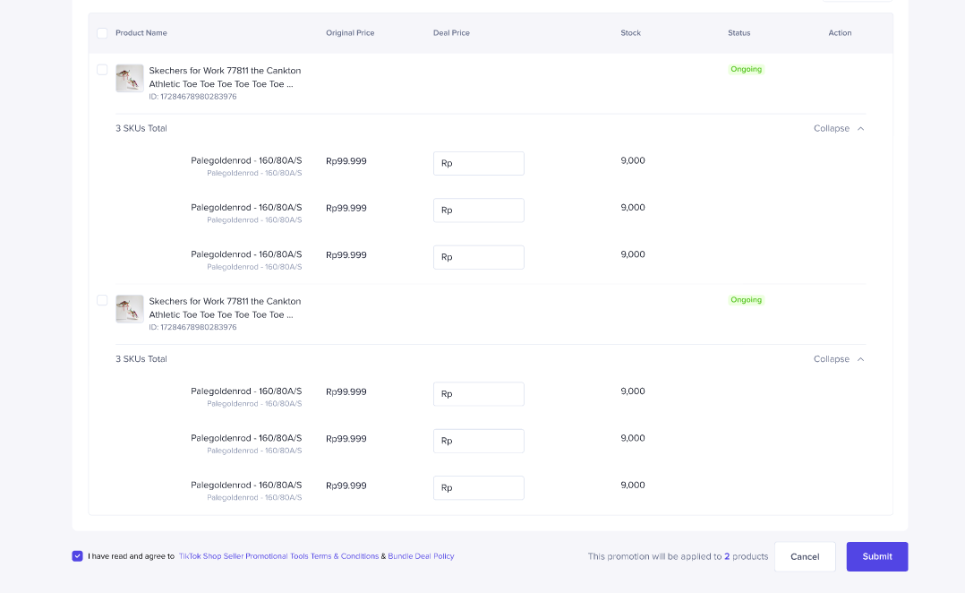 输入先前选择的产品组合的每个 SKU 的交易价格或折扣百分比值。 所有 SKU 的 Deal Price 价格必须低于原价。