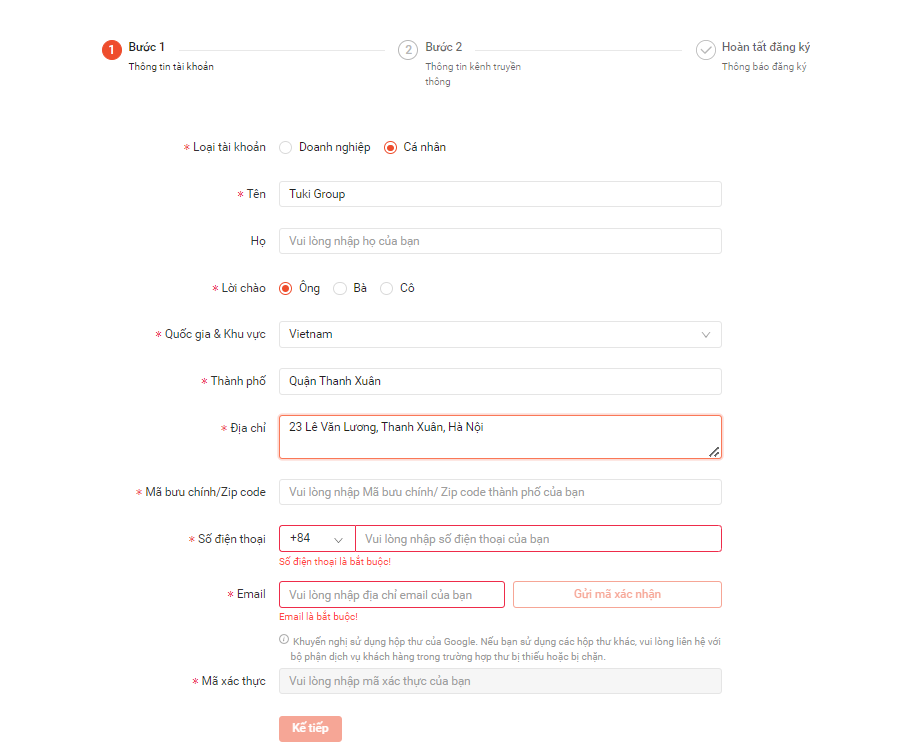 Bước 2: Chọn loại tài khoản cá nhân hoặc doanh nghiệp và điền đầy đủ thông tin vào form đăng ký. Sau đó, nhấn “Gửi đi” để hoàn thành đăng ký tài khoản