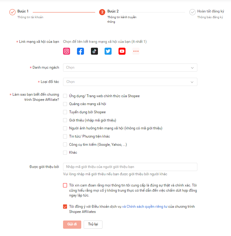 Bước 3: Nhập thông tin các kênh quảng bá Affiliate Shopee mà bạn sở hữu và nhấn “Gửi đi”.