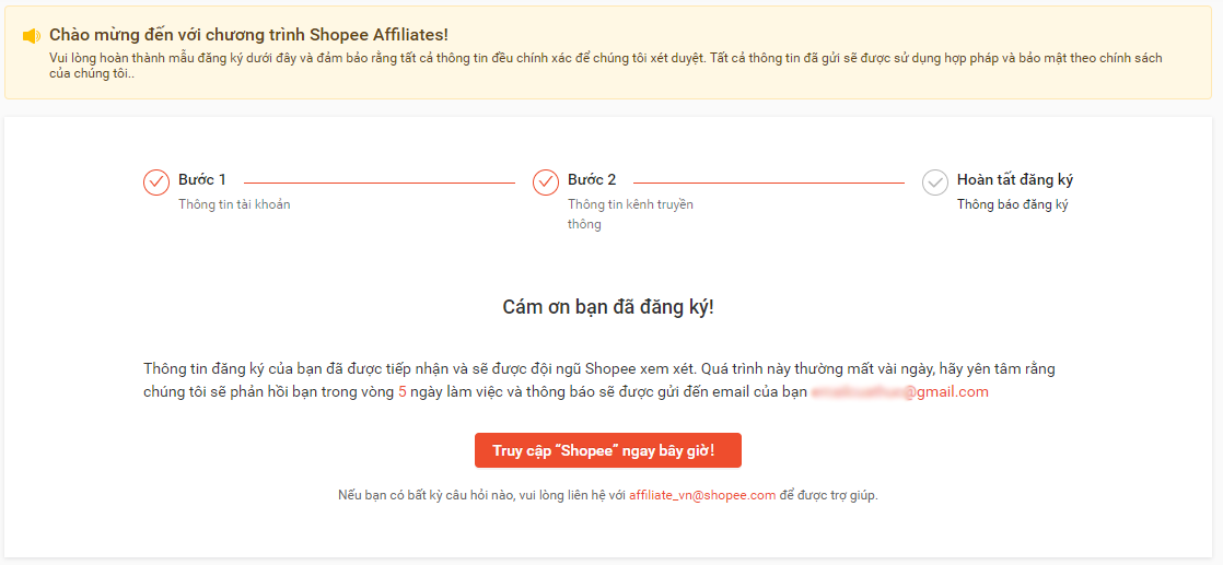 Bước 5: Sau khi hoàn tất quá trình đăng ký, bạn sẽ nhận được email từ Shopee và sau khi gửi email hoặc video để kiểm duyệt, bạn chỉ cần chờ đợi phản hồi từ Shopee (thường là trong vòng 1-2 ngày).