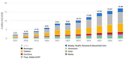 本地的电商消费者主要年龄在25-34岁之间。2022年电子商务总额构成中,最畅销的类目分别是电子产品、时尚、玩具和爱好、个人护理。