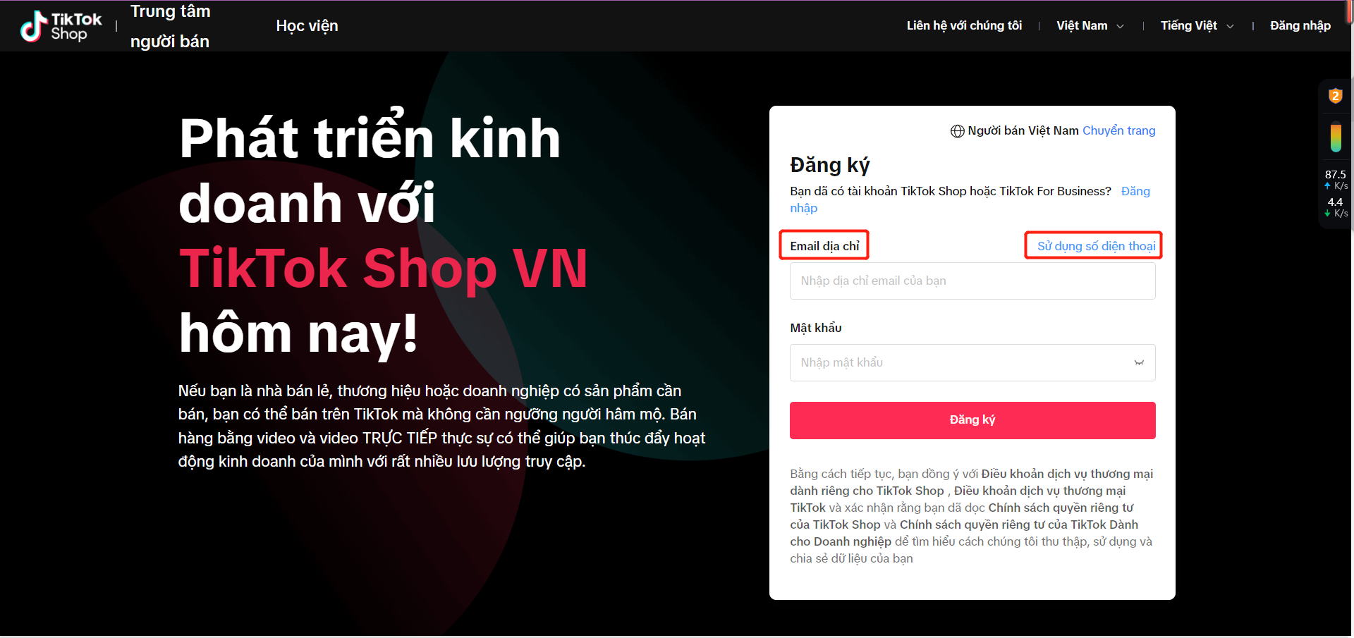 4.2.2 Tạo tài khoản TikTok Shop bằng số điện thoại hoặc email