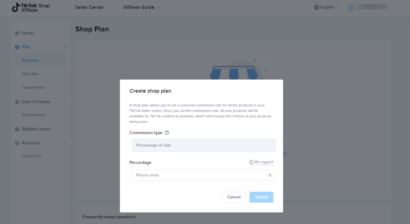 Shop plan allows TikTok creators to promote all of your products in your TikTok shop. You can go to TikTok Shop Affiliate > Plan > Shop Plan, and create a shop plan. What you need to do is set a commission rate, and it is for all products in your shop.