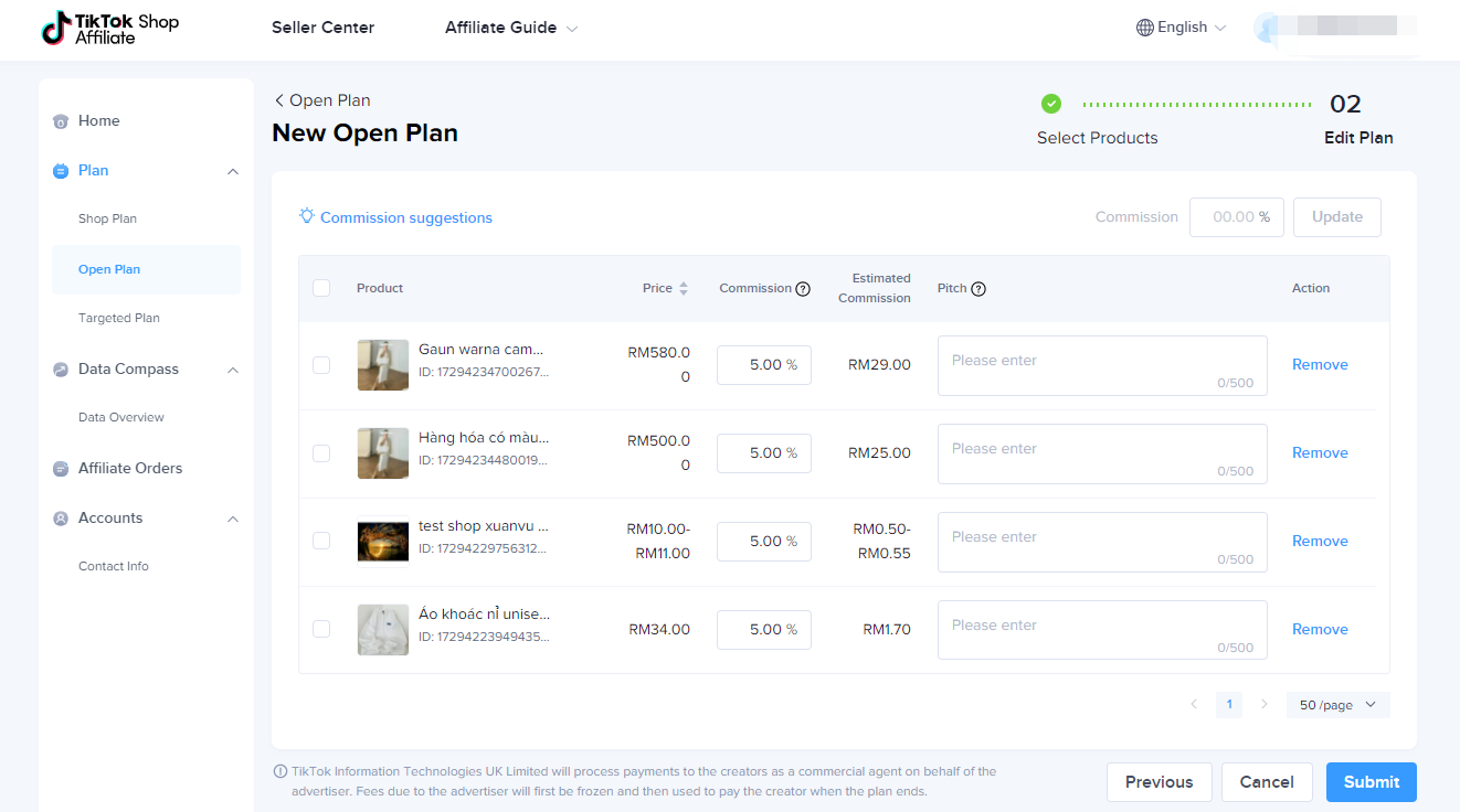 You can go to create an open plan, select one or more products and set commission for your products. Besides, you can add the pitch to describe the key features and benefits of your products, then the TikTok creators can know how to promote your products.