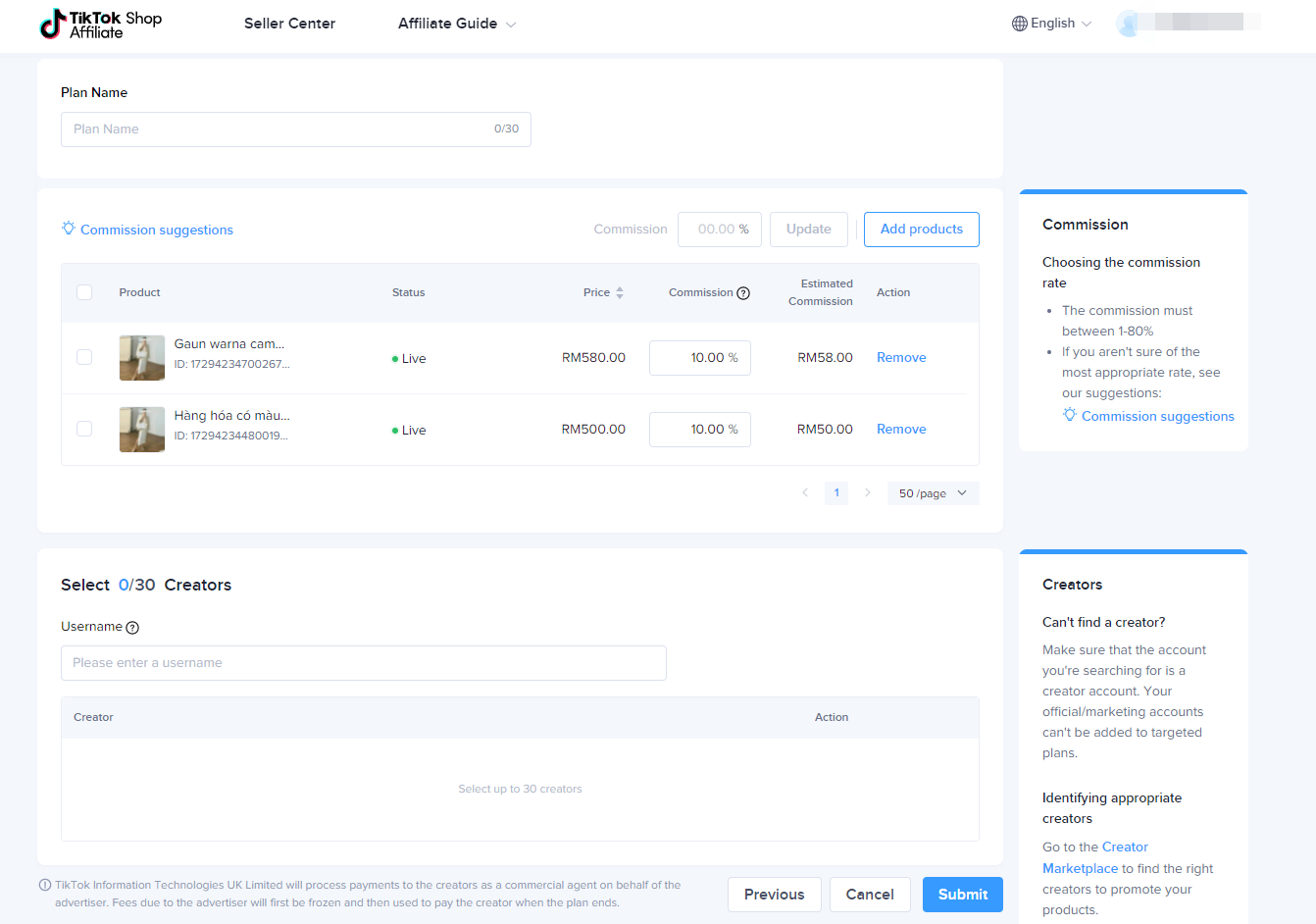 With the targeted plan, you can invite the targeted creators to promote products for you, and creators can start promotion after they accept your invitation. You can create a targeted plan, select one or more products and set commission, then you can select up to 30 TikTok creators. It is better to contact your interested creators first.