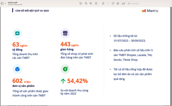 Nền tảng số liệu thị trường Metric (Metric) vừa phát hành báo cáo thị trường thương mại điện tử (TMĐT) quý 3/2023.