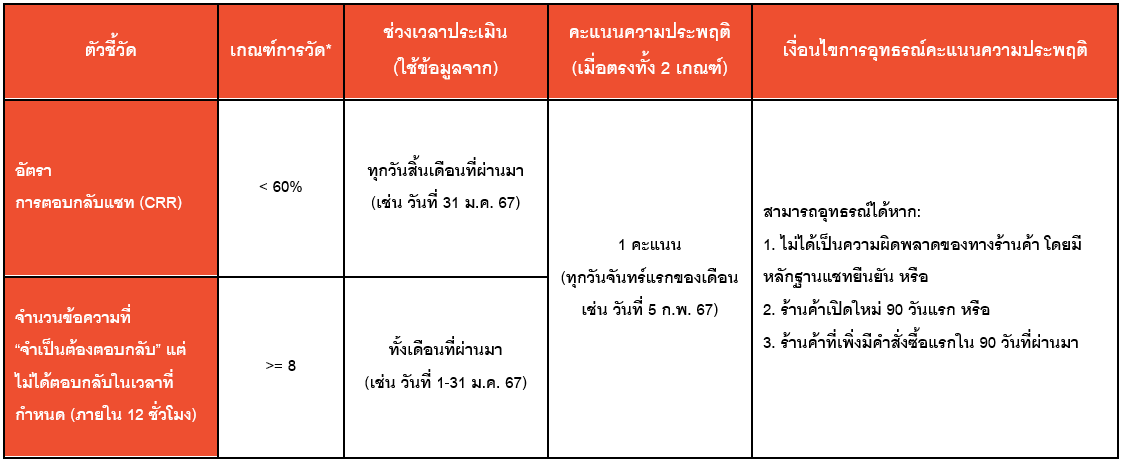 ตอบ: ไม่ได้รับ ร้านจะได้รับคะแนนก็ต่อเมื่อประสิทธิภาพในการตอบกลับแชทล่าช้า เข้าตาม “เกณฑ์การได้รับคะแนนความประพฤติ” ทั้ง 2 เกณฑ์ในเดือนที่ผ่านมา