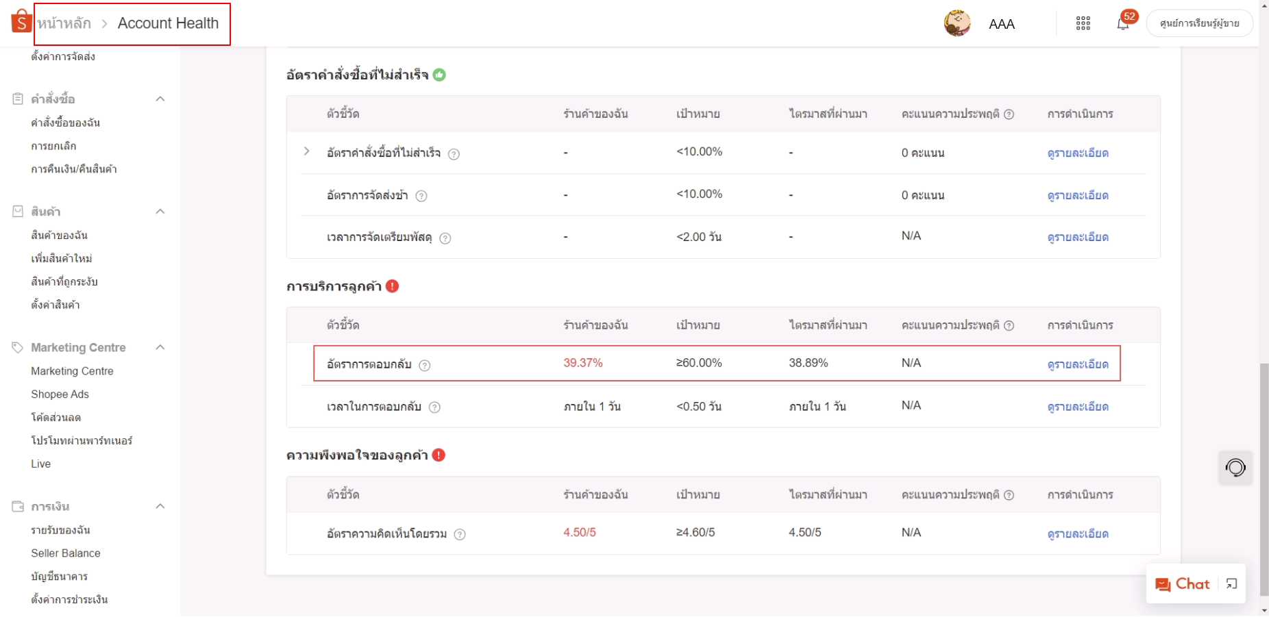 ตอบ: ตรวจสอบได้ที่เมนู Account Health คลิก ใต้หัวข้อ “สถิติร้านค้า” >> การบริการลูกค้า >> อัตราการตอบกลับ