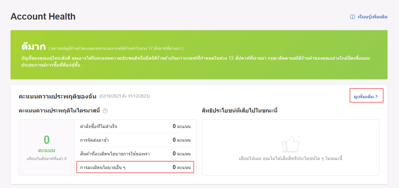 ตอบ:ตรวจสอบคะแนนความประพฤติได้ที่เมนู Account Health โดยจะแสดงในหัวข้อ “การละเมิดนโยบายอื่น ๆ” (Other Violations)