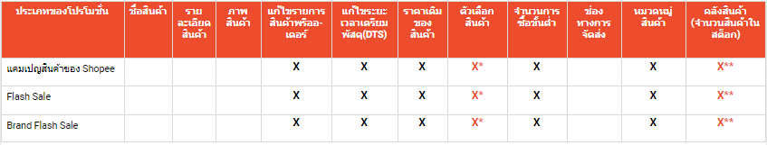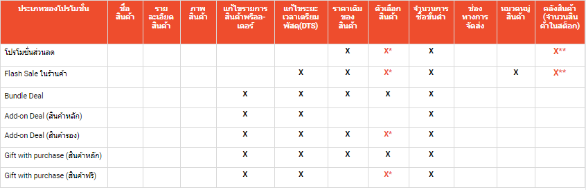 ทั้งนี้ ท่านสามารถตรวจสอบรายละเอียดของสินค้าในส่วนที่ไม่สามารถแก้ไขได้ตามประเภทของโปรโมชั่นที่เข้าร่วม ตามตารางด้านล่างนี้