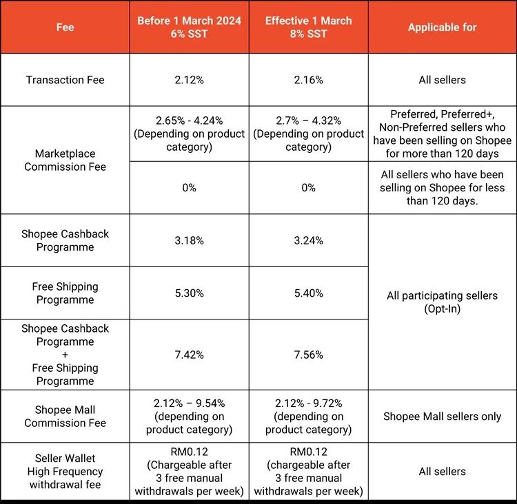 SST 适用于交易费、市场佣金费、其他适用的营销计划服务费、卖家钱包高频提款费(如适用)、Shopee 营销套餐和付费广告积分。