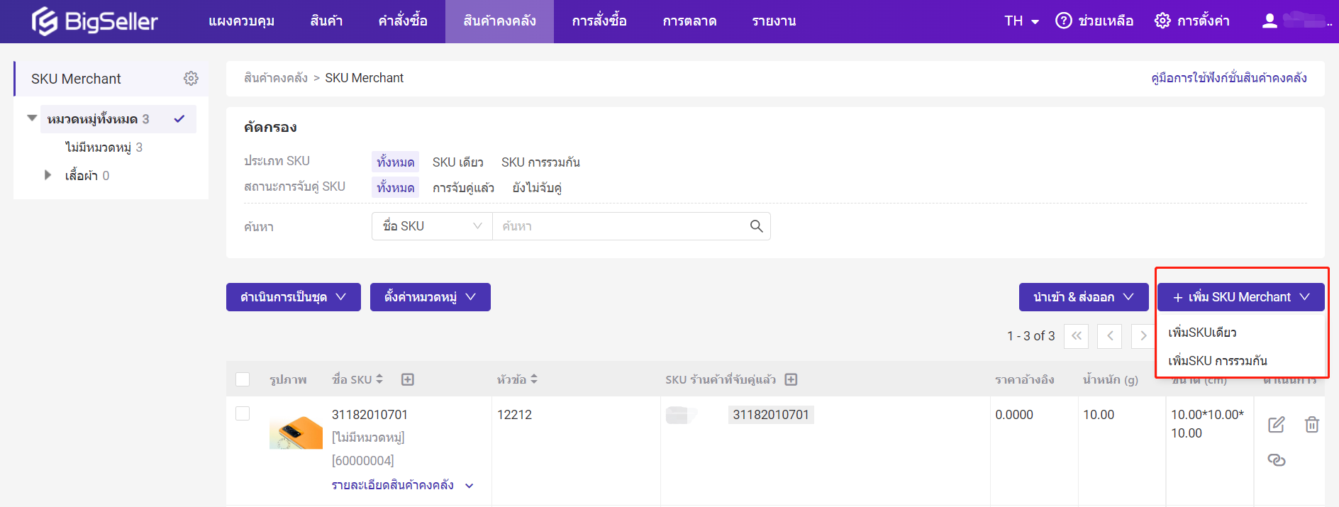 SKU Merchant ในระบบ BigSeller จะใช้สำหรับการดูแลรักษาข้อมูลเบื้องต้นของสินค้า ได้แก่ รูปภาพ รุ่น สี ขนาดของสินค้า เป็นตัวระบุสินค้าเพื่อแยกแยะสินค้าในคลังสินค้าของตนเองและระบุ SKU ที่พ่อค้าแม่ค้าออนไลน์สร้างใน Seller Centre
