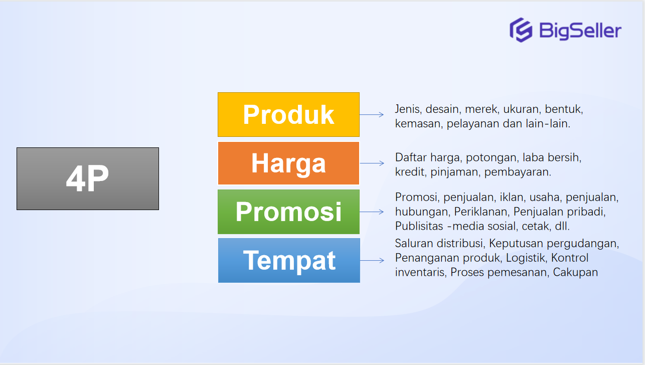Konsep marketing 4P ini memiliki 4 aspek elemen yang saling berhubungan, dan setiap elemen sangat berpengaruh terhadap perkembangan bisnis anda. Jika anda dapat mengaplikasikannya dengan baik maka strategi pemasaran ini akan membantu penjualan bisnis anda melesat pesat.