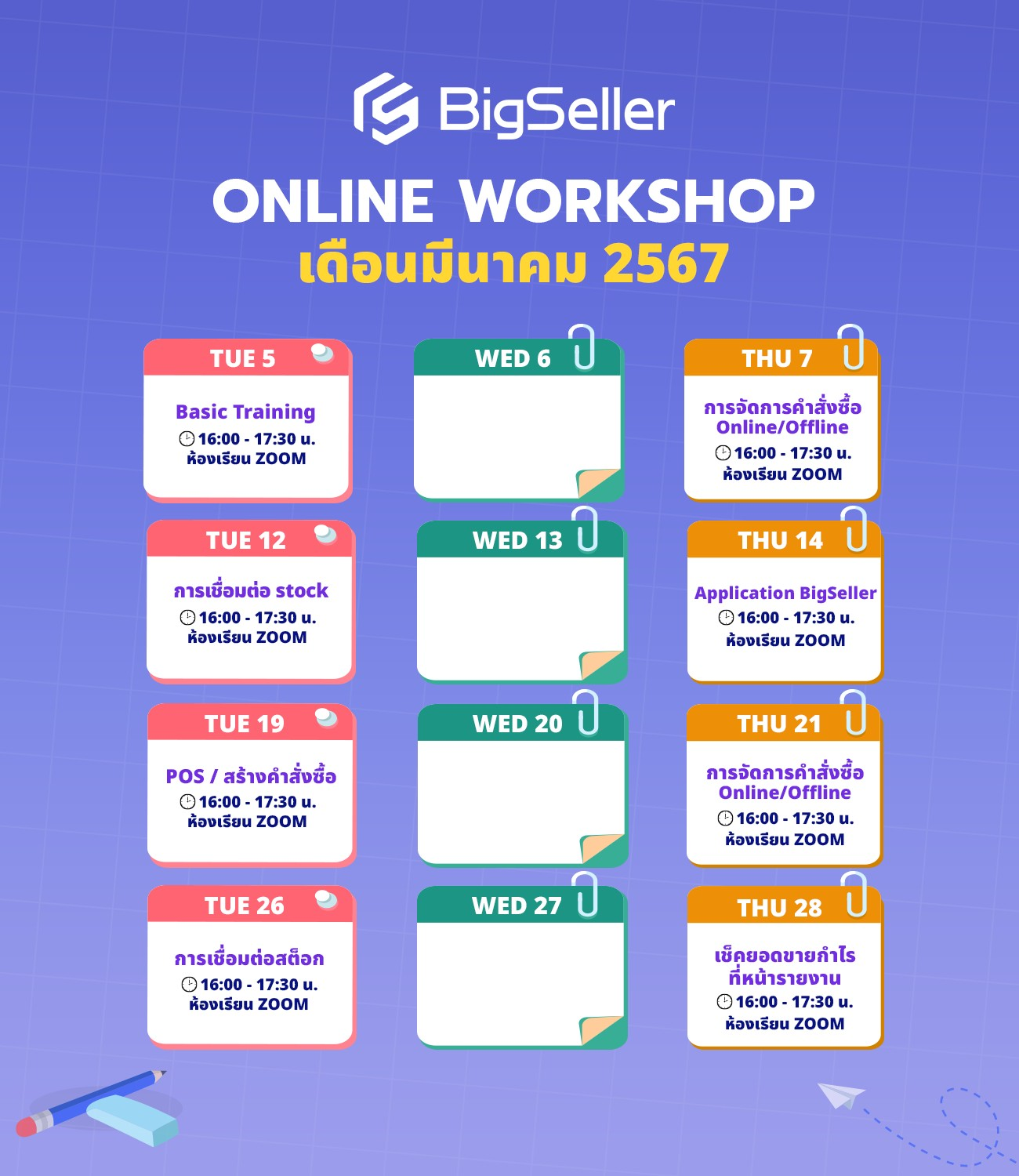 อบรมประจำสัปดาห์ตลอดเดือนมีนาคม เพื่อช่วยเหลือผู้ขายที่พึ่งผูกร้านค้าเข้ามาใช้งานระบบ BigSeller ใหม่เพื่อพัฒนาร้านค้าและจัดการออเดอร์อย่างเป็นระบบ และร่วมสนุกกับกิจกรรมสุดพิเศษลุ้นรับ Bigcoin จำนวน 60 เหรียญตลอดทั้งเดือนมีนาคม โดยสามารถเลือกคลาสเรียนที่เหมาะสมและลงทะเบียนเข้าเรียนฟรีได้ตลอดทั้งเดือน
