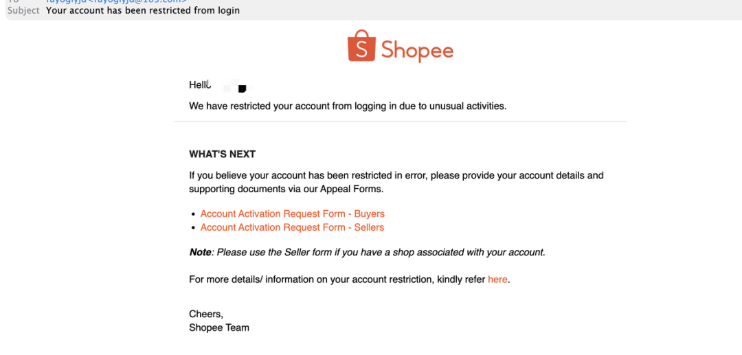 一些卖家接到了来自平台的邮件通知,告知其账户受限,若认为账户被错误限制,通过账户激活申请表来申诉。并且部分卖家反映除了无法登录之外,他们的款项提取功能同样受到了限制。