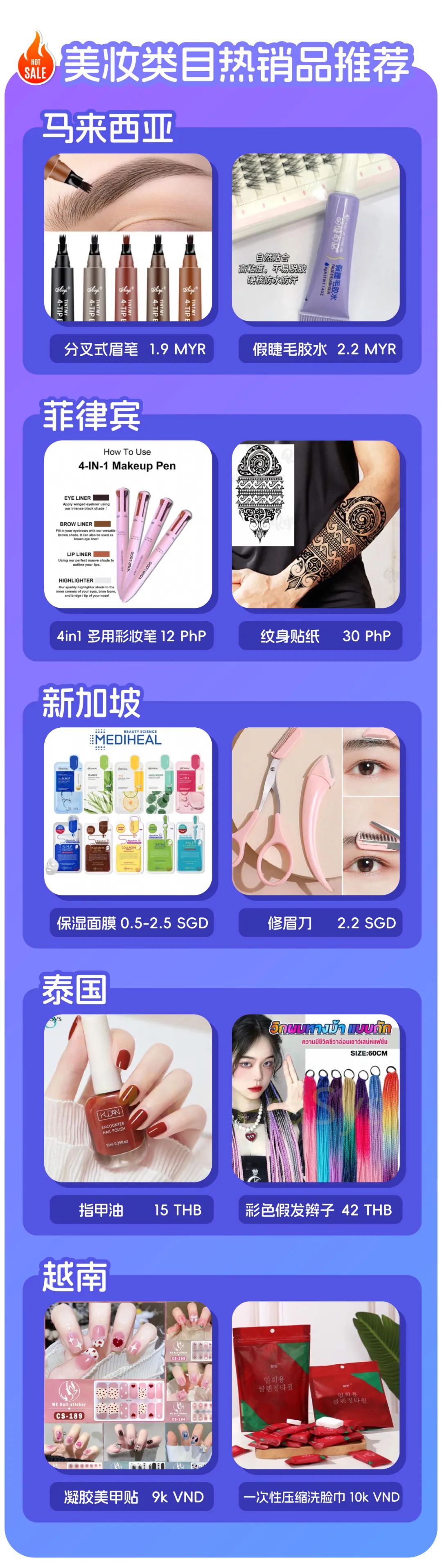 对于爱美的东南亚消费者而言,眼妆、美甲、发型成为当地女性主要的消费趋势,年轻化的市场环境也使消费者在购买决策上更看重产品的性价比,其中多用型彩妆笔广受欢迎,例如多用型眉笔,一支满足眉毛、眼线、卧蚕的化妆需求,或者是集棕色、灰色、高光色等多种颜色的4 IN 1彩妆笔,都成为了当地消费者选择的热门单品。