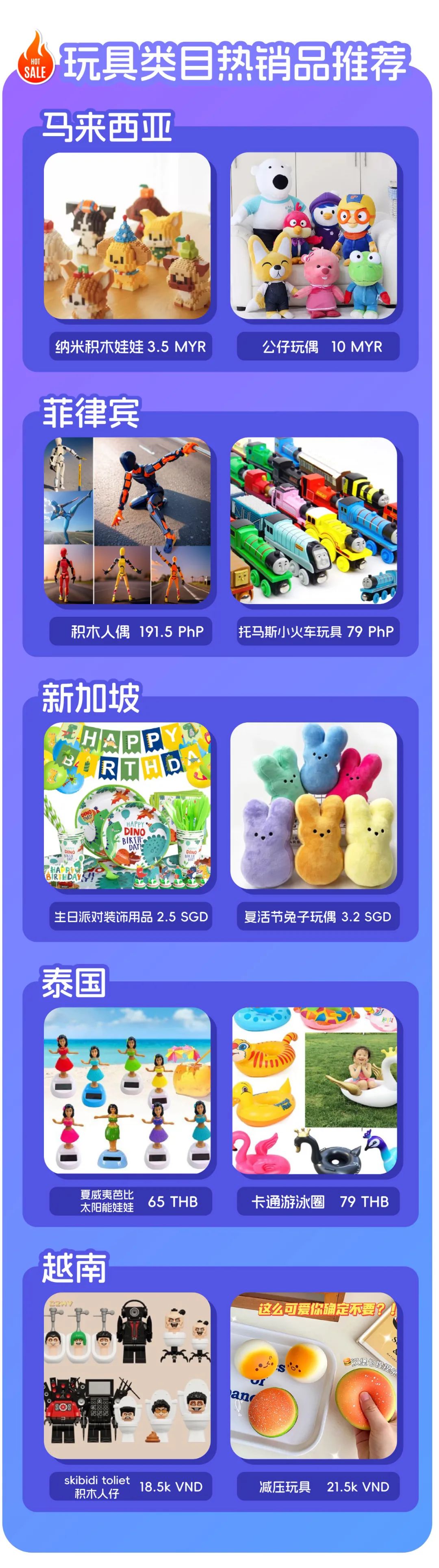 同样受到人口结构、生育率相关趋势影响的还有玩具类目,有着人口优势的东南亚地区无疑是利好“儿童经济”与玩具产业的重要市场之一。根据2021年数据显示,东南亚整体14岁以下人口总数达3.04亿,占总人口的28.7%左右,拥有着十分庞大的玩具及游戏消费人口。派对用品、IP玩具以及早教益智类积木玩具等深受当地消费者的青睐。