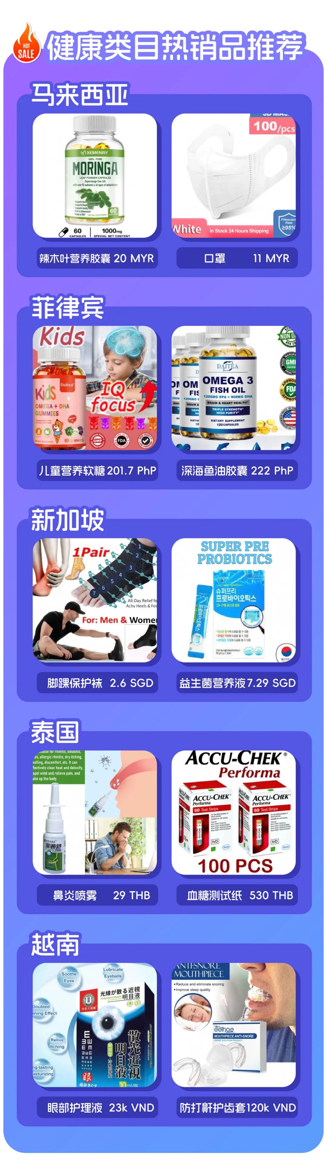 与此同时,东南亚消费者对电商平台越来越信赖,也更愿意通过网络购买中国医疗类产品。来自中国的鼻炎喷雾和血糖仪测试纸在泰国站点都有较好的表现,当地消费者对于来自中国的跨境健康类目产品接受程度愈来愈高。