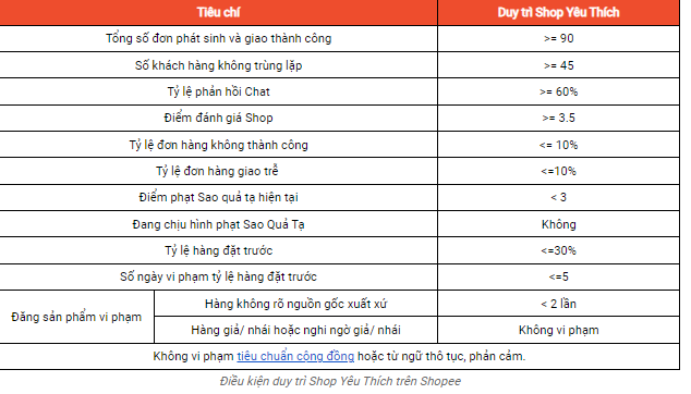 Tiêu chí và điều kiện duy trì Shop Yêu Thích
