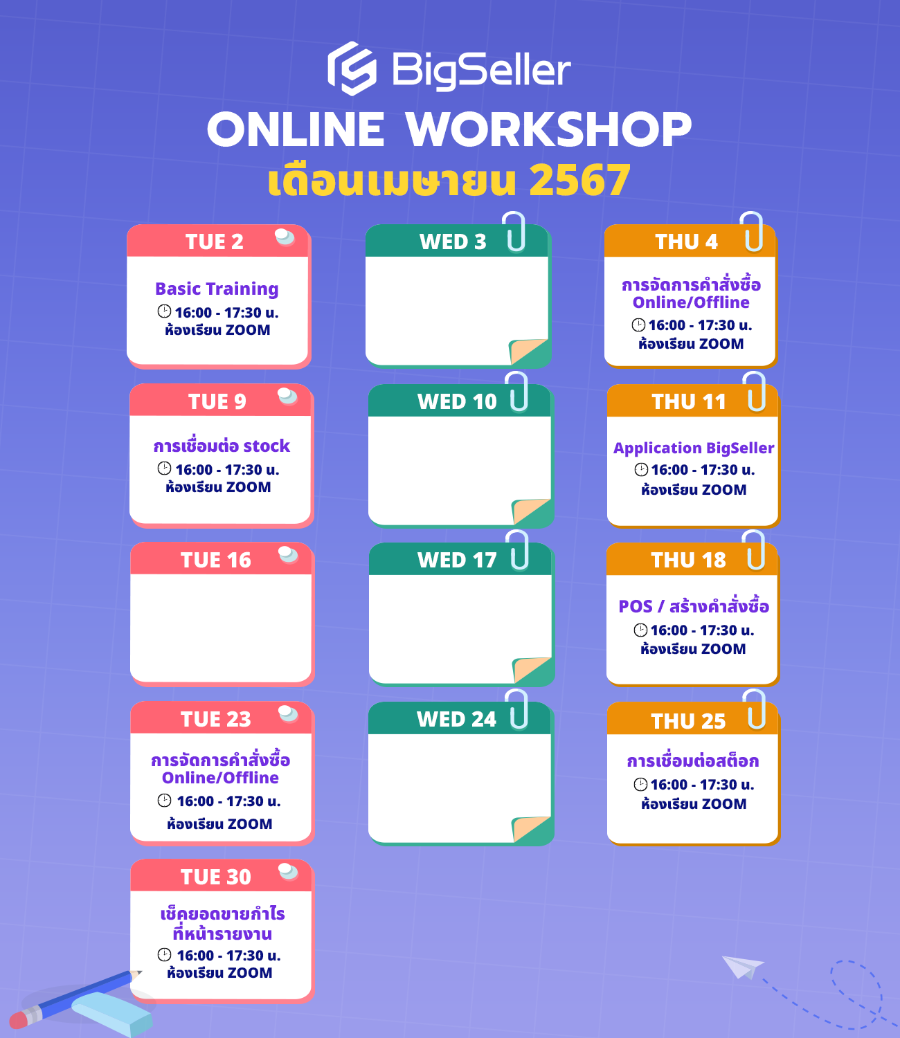 อบรมประจำสัปดาห์ตลอดเดือนเมษายน พ.ศ. 2567 เพื่อช่วยเหลือผู้ขายที่พึ่งผูกร้านค้าเข้ามาใช้งานระบบ BigSeller ใหม่เพื่อพัฒนาร้านค้าและจัดการออเดอร์อย่างเป็นระบบ และร่วมสนุกกับกิจกรรมสุดพิเศษลุ้นรับ Bigcoin จำนวน 60 เหรียญตลอดทั้งเดือนเมษายน โดยสามารถเลือกคลาสเรียนที่เหมาะสมและลงทะเบียนเข้าเรียนฟรีไม่มีค่าใช้จ่ายได้ตลอดทั้งเดือน