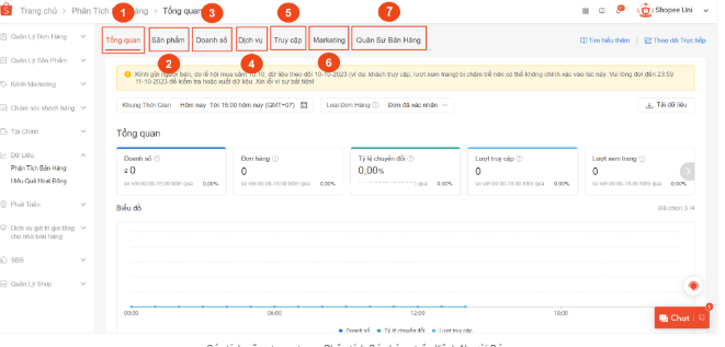 Bạn có thể truy cập các chỉ số trong Phân Tích Bán Hàng Shopee trong 6 bảng sau: