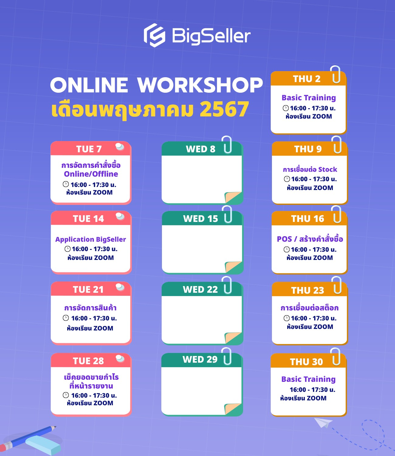 อบรมประจำสัปดาห์ตลอดเดือนพฤษภาคม พ.ศ. 2567 เพื่อช่วยเหลือผู้ขายที่พึ่งผูกร้านค้าเข้ามาใช้งานระบบ BigSeller ใหม่เพื่อพัฒนาร้านค้าและจัดการออเดอร์อย่างเป็นระบบ และร่วมสนุกกับกิจกรรมสุดพิเศษลุ้นรับ Bigcoin จำนวน 60 เหรียญตลอดทั้งเดือนเมษายน โดยสามารถเลือกคลาสเรียนที่เหมาะสมและลงทะเบียนเข้าเรียนฟรีไม่มีค่าใช้จ่ายได้ตลอดทั้งเดือน
