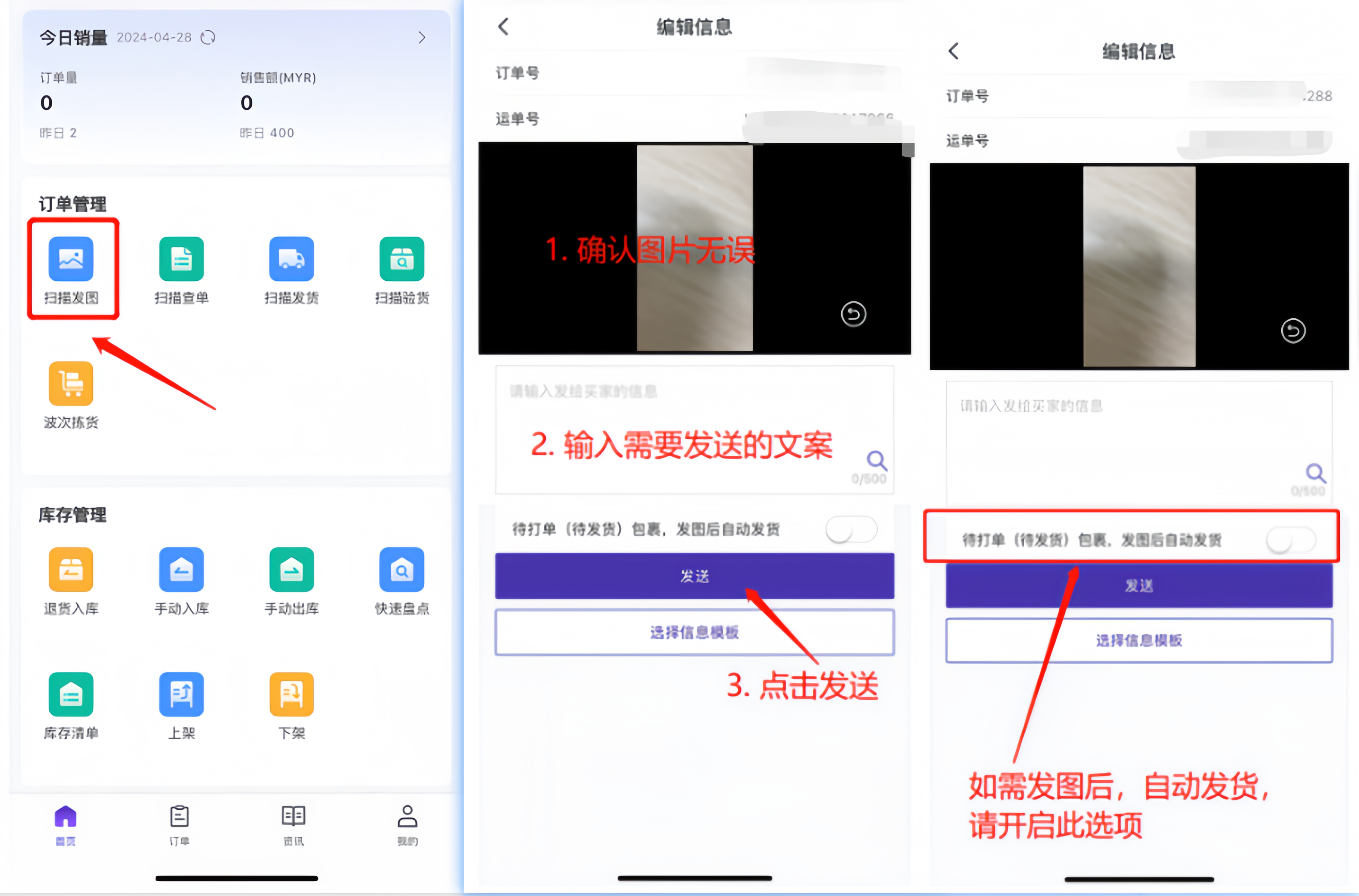 打开BigSeller App,扫描面单,给打包好的产品拍照,输入跟图片一起发送的文案,例如:您的包裹已经发货,点击发送即可。