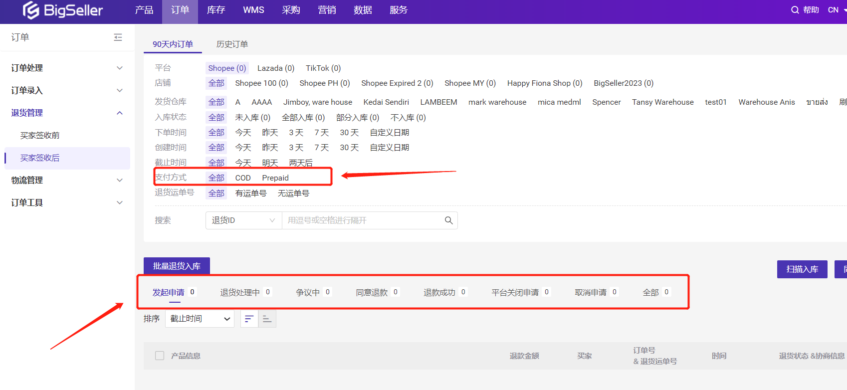除了以上产生的费用外,卖家最担心的就是买家退货退款的COD订单,在发回卖家仓库的时候能不能正常追踪,有效追踪,防止货物丢失,无法正确入库,最终导致仓库混乱,BigSeller的退货管理功能就能派上用场啦~针对退货退款订单,BigSeller能够追踪状态,并能够通过支付方式分类来快速筛选订单~