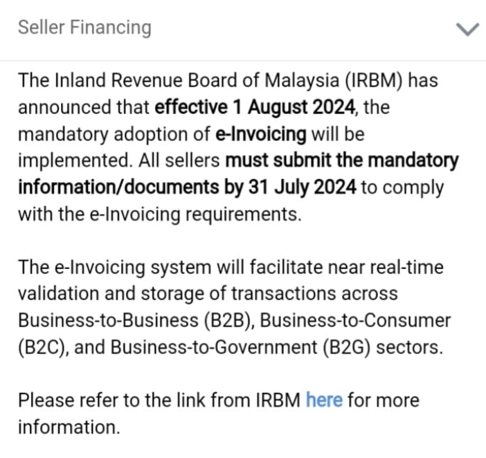 通知称,马来西亚税务局(IRBM)宣布了一项重大举措,自 2024 年 8 月 1 日起,所有商业交易将强制使用电子发票,此举旨在促进 B2B、B2C 和 B2G 部门交易的透明度与效率,实现近乎实时的发票验证和存储。