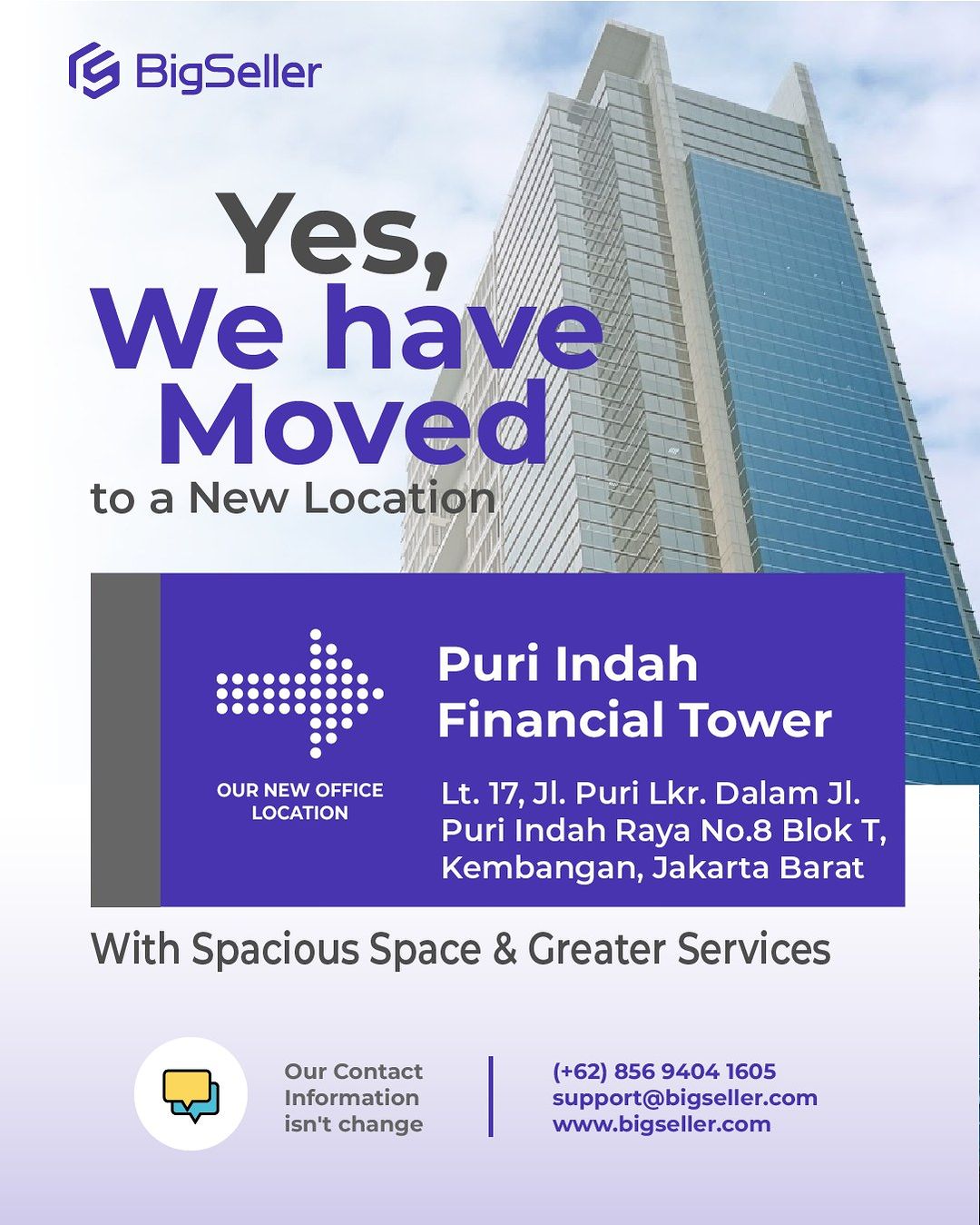 We are moving! Mulai tanggal 1 Juli, Puri Indah Financial Tower Lt. 17, Jl. Puri Lkr. Dalam Jl. Puri Indah Raya No.8 Blok T, Kec. Kembangan, Kota Jakarta Barat, Daerah Khusus Ibukota Jakarta 11610. Dengan ruangan yang lebih luas dibandingkan sebelumnya, kami akan dapat menyediakan banyak ruangan untuk kemudahan dalam training pengguna kami, With Spacious Space & Greater Services. Harap dicatat / kontek nomor telepon kami: (+62) 856 9404 1605 atau email: support@bigseller.com .Datanglah selama bulan Juli dan manfaatkan training offline atau online secara gratis. Buat yang ingin berkunjung ke kantor baru BigSeller untuk tau cara berbisnis atau sekerdar sharing dengan tim BigSeller juga bisa langsung hubungi kontek yang tertera ya Seller~