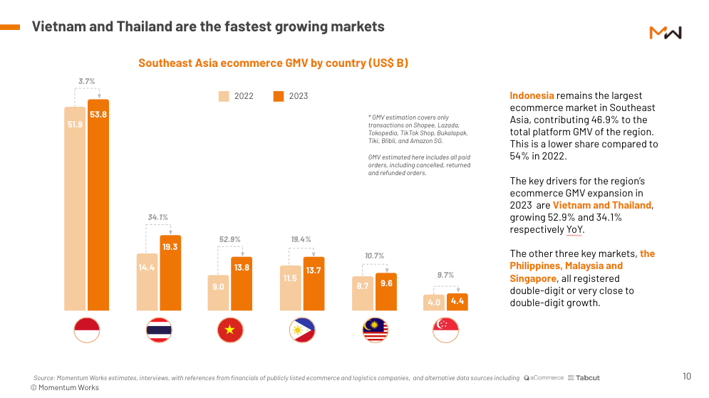 ตามรายงาน“อีคอมเมิร์ซในเอเชียตะวันออกเฉียงใต้ (Ecommerce in Southeast Asia 2024 report)” โดย Momentum Works ประเทศไทยเป็นตลาดอีคอมเมิร์ซที่ใหญ่เป็นอันดับ 2 ในเอเชียตะวันออกเฉียงใต้รองจากอินโดนีเซีย และมีอัตราการเติบโตเร็วเป็นอันดับ 2 (รองจากเวียดนาม) โดยมีการเติบโต year-on-year 34.1%