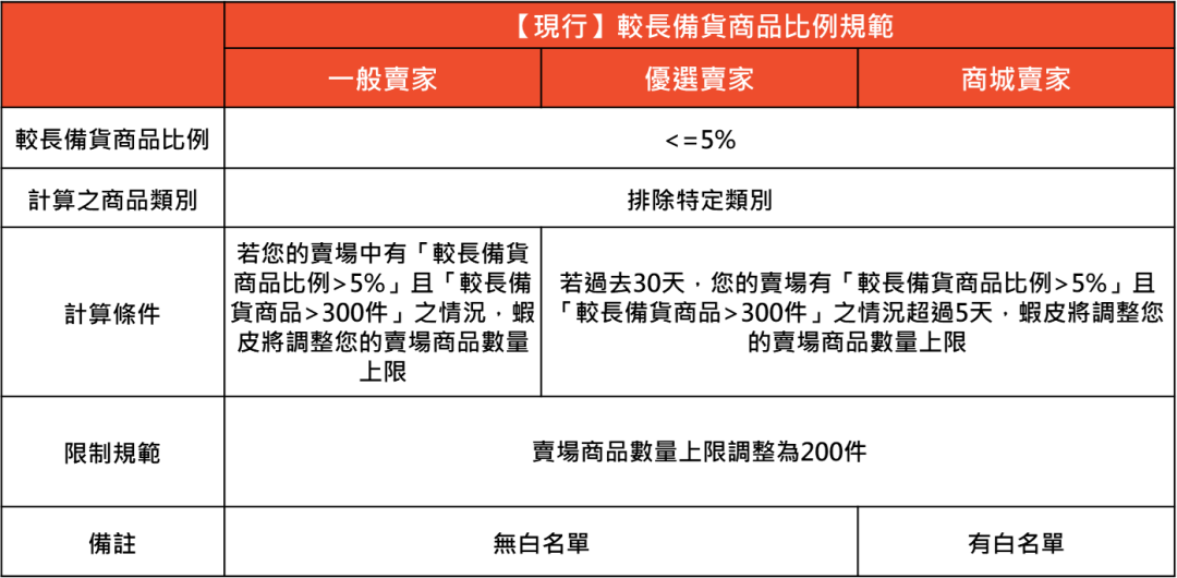 (1) 较长备货商品比例<=5% 或(2) 较长备货商品数<=300 = 其中一项门槛达标即可=
