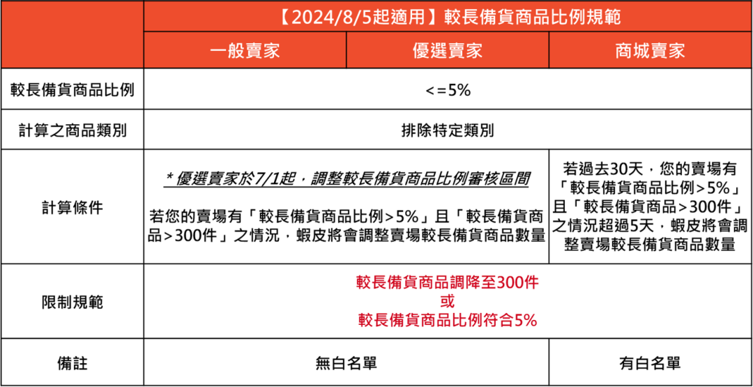 💡提醒您:由于较长备货商品比例审核会查看卖场过去表现,因此还请您务必于规范上线前提前检视卖场商品备货天数设定及比例,避免 2024/8/5 规范上线后因卖场过去表现影响卖场营运。