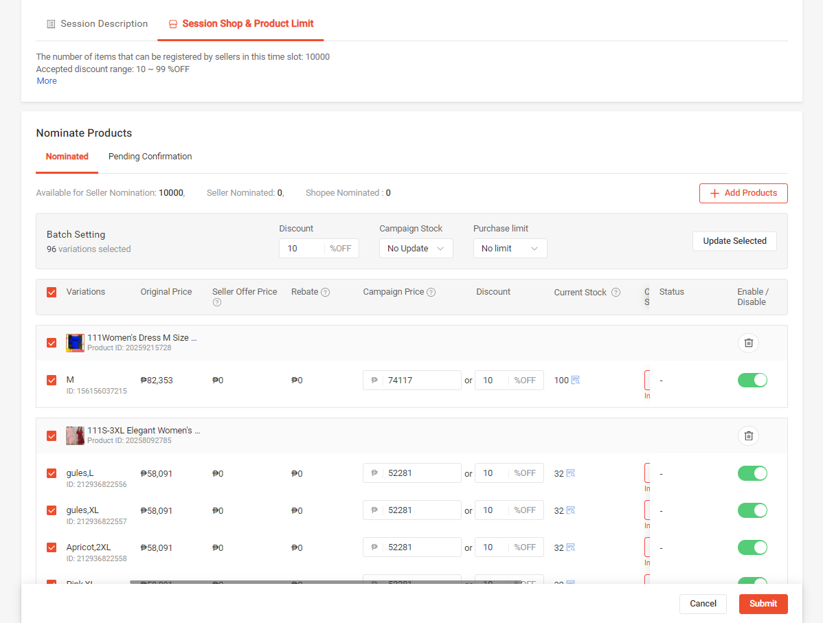 Step 3. Click Nominate to nominate your products for campaign, then you can select products and input discounts for the selected products.