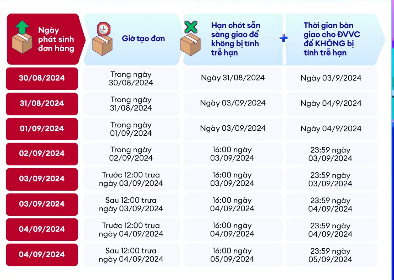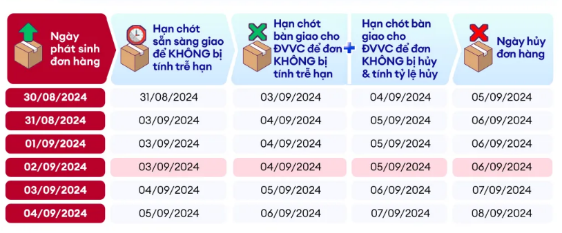 Ví dụ: Đơn hàng phát sinh vào 8:00 sáng ngày 30/8/2024 thì NBH cần bấm "Sẵn sàng giao" trước 8:00 sáng ngày 31/8/2024 và bàn giao cho ĐVVC trước 8:00 sáng ngày 1/9/2024.