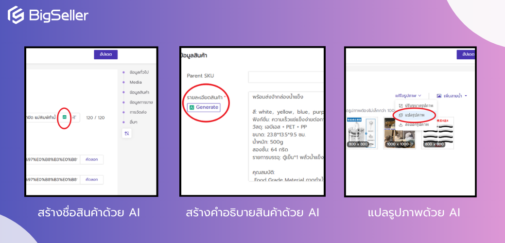 เพื่อรับมือกับความท้าทาย BigSeller ได้มีฟังก์ชัน AI ซึ่งสามารถสร้างข้อมูลสินค้าโดยอัตโนมัติและให้บริการแปลอย่างมีประสิทธิภาพ ฟังก์ชัน AI ของ BigSeller ประกอบด้วย: