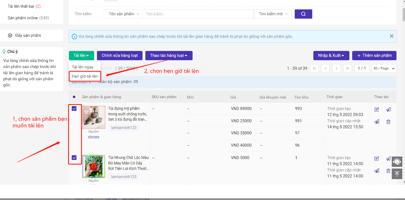 Tính năng này hiện hỗ trợ Shopee, Lazada, TikTok, hẹn giờ tải lên sản phẩm tức là chọn thời gian số người truy cập và mua hàng vào giờ cao điểm để đăng sản phẩm. Bạn có thể hẹn giờ tải lên từng sp hoặc tải hàng loạt, có thể tải gián đoạn hoặc tải liên tục.