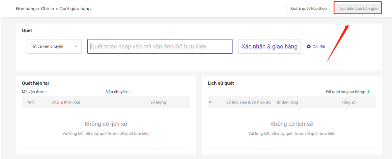 Sau khi đã quét bưu kiện và xác nhận giao hàng, bạn ấn tạo biên bản bàn giao ở góc trên bên phải, hệ thống sẽ tạo ra biên bản bàn giao luôn.