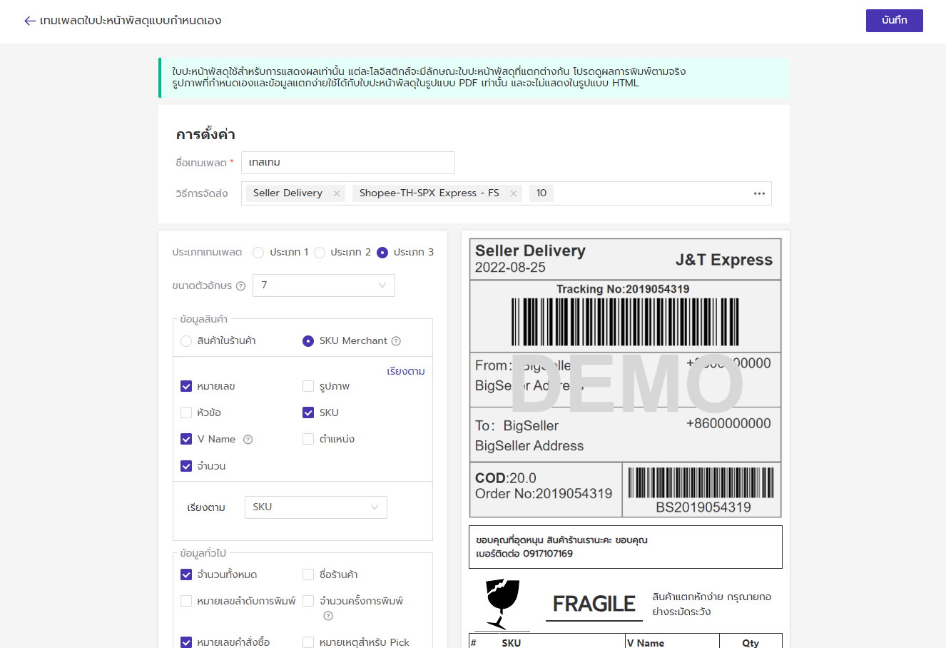 ฟีเจอร์ใบปะหน้าพัสดุแบบกำหนดเองของ BigSeller ยังอนุญาตให้ผู้ขายอัปโหลดรูปภาพที่กำหนดเองได้ ตั้งค่าหมายเหตุบนใบปะหน้า เพิ่ม Logo และแสดงข้อมูลสินค้าที่เปราะบาง ฟีเจอร์เหล่านี้ให้ตัวเลือกการปรับแต่งที่มากขึ้น ผู้ขายสามารถนำภาพลักษณ์ของแบรนด์มาใช้ในดีไซน์ของใบปะหน้า เพิ่มความเป็นมืออาชีพและสร้างความประทับใจให้กับลูกค้า นอกจากนี้ ก่อนการจัดส่งยังสามารถตรวจสอบว่าสินค้าในพัสดุถูกต้องหรือไม่ เพื่อให้มั่นใจในความถูกต้องของการจัดส่งมากขึ้น