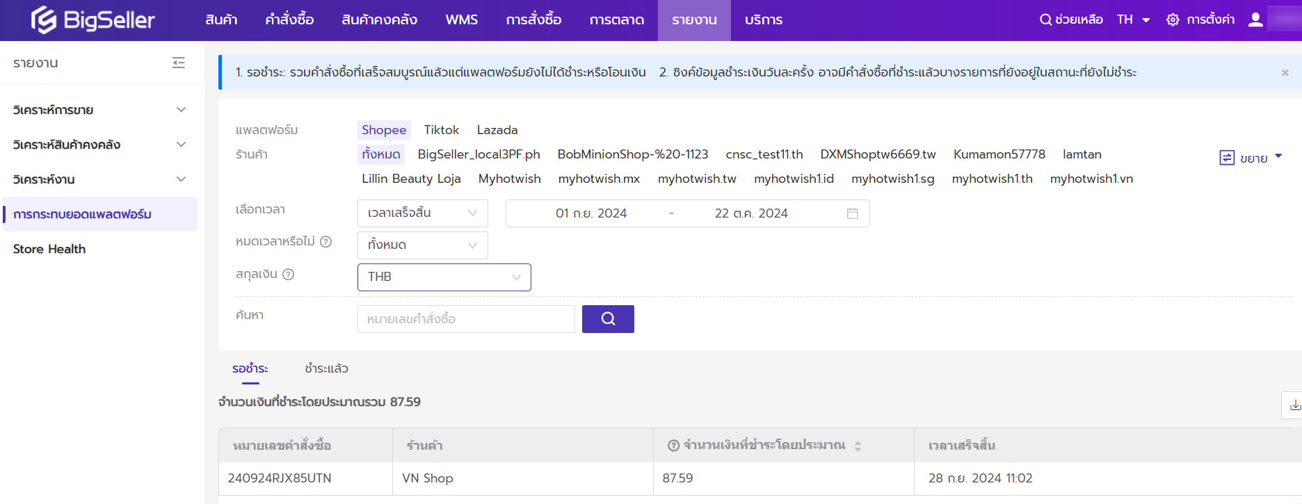- การกระทบยอดแพลตฟอร์ม: คุณสามารถตรวจสอบสถานะการชำระเงินของคำสั่งซื้อจากแพลตฟอร์ม ช่วยตรวจสอบได้อย่างง่ายดายว่าคำสั่งซื้อได้รับเงินจากทางแพลตฟอรืมและถูกต้องหรือไม่