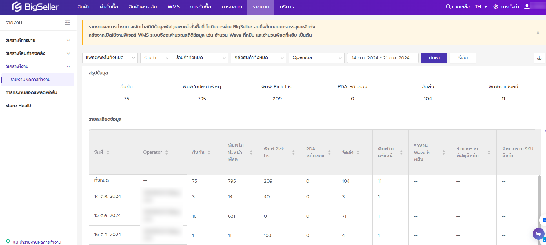 - รายงานผลการทำงาน: ฟีเจอร์นี้ช่วยให้คุณติดตามและประเมินประสิทธิภาพของการปฏิบัติงานของพนักงาน เช่น การหยิบสินค้า การบรรจุสินค้าหรือการจัดส่ง นอกจากนี้ยังช่วยให้คุณเห็นปัญหาที่อาจเกิดขึ้นและปรับปรุงกระบวนการทำงานได้อย่างรวดเร็ว