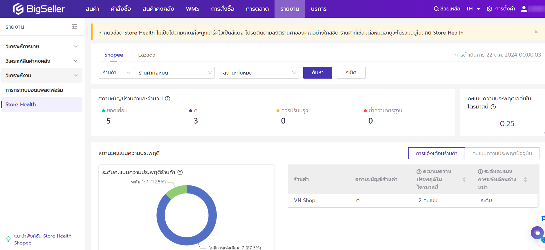 - Store Health: ฟีเจอร์นี้จะแสดงภาพรวมการดำเนินงานของร้านค้า เพื่อให้ผู็ขายสามารถตรวจสอบผลการดำเนินงานของร้านค้าให้เป็นไปตามกฎระเบียบของแพลตฟรอ์ม และป้องกันการได้รับคะแนนความประพฤติ