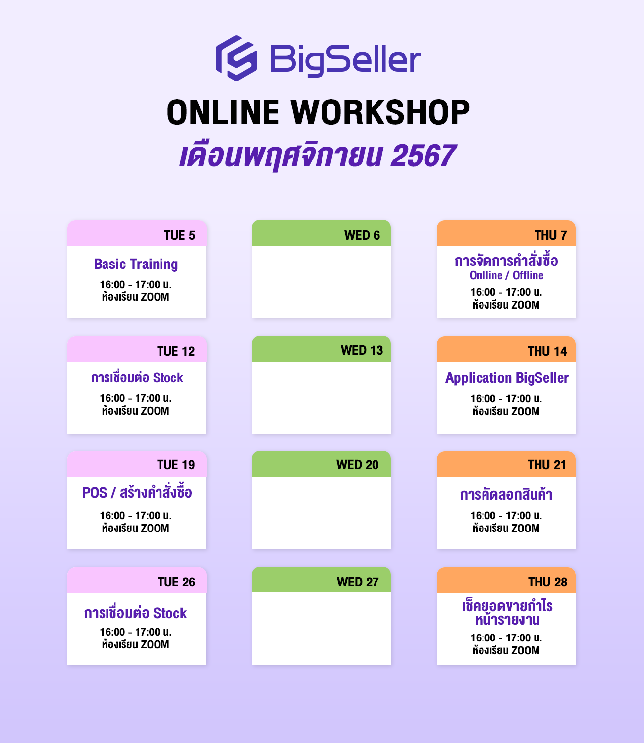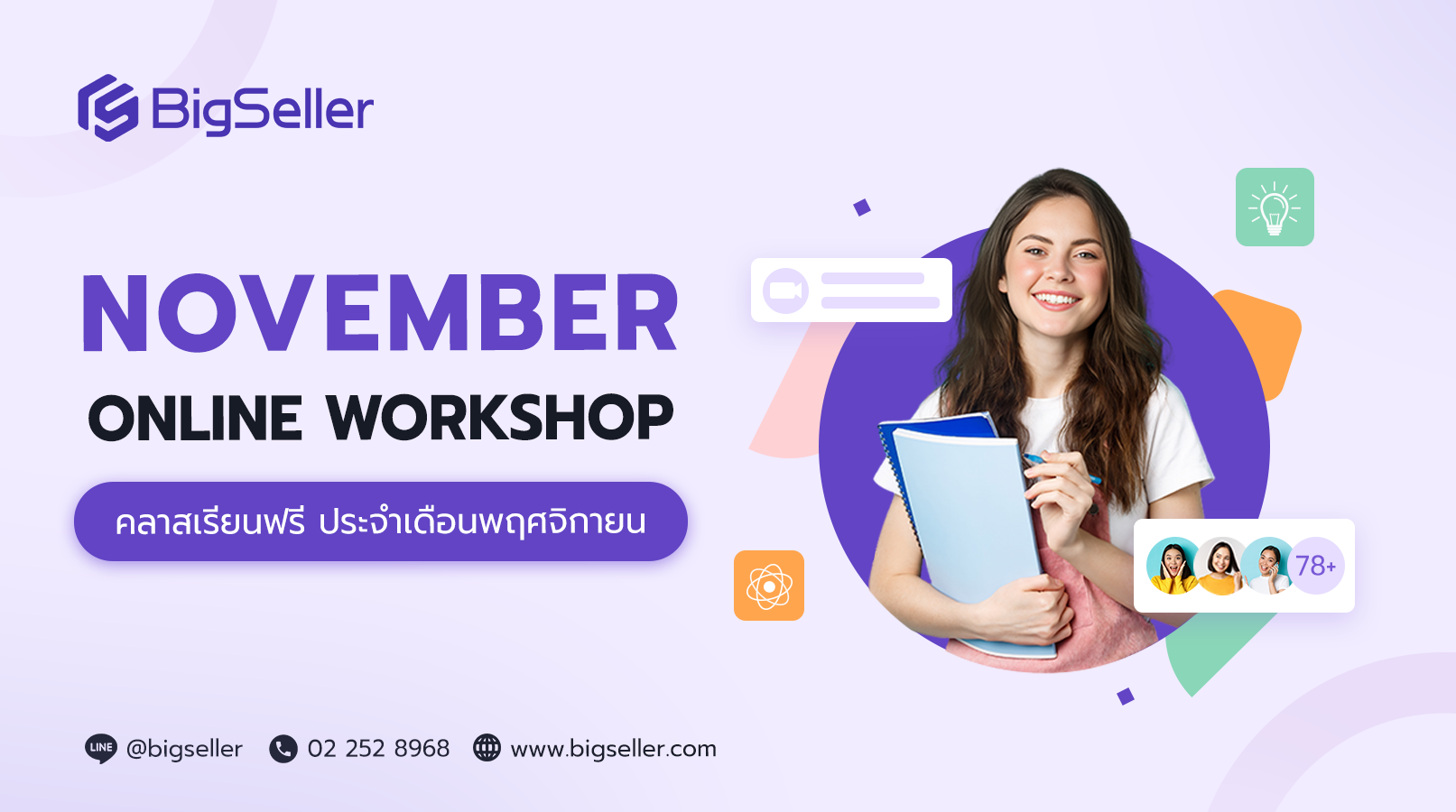 อบรมประจำสัปดาห์ตลอดเดือนพฤศจิกายน เพื่อช่วยเหลือผู้ขายที่พึ่งผูกร้านค้าเข้ามาใช้งานระบบ Bigseller ใหม่เพื่อพัฒนาร้านค้าและจัดการออเดอร์อย่างเป็นระบบ และร่วมสนุกกับกิจกรรมสุดพิเศษลุ้นรับ Bigcoin จำนวน 60 เหรียญตลอดทั้งเดือนพฤศจิกายน โดยสามารถเลือกคลาสเรียนที่เหมาะสมและลงทะเบียนเข้าเรียนฟรีได้ตลอดทั้งเดือน