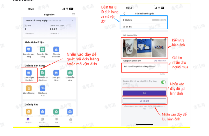 Quét để gửi hình ảnh :tính năng này là chụp ảnh gói hàng để gửi cho người mua thông qua trò chuyện khi đóng gói gói hàng. Khi bạn gặp phải tranh chấp hàng hoàn từ người mua hoặc khiếu nại với shopee và cần cung cấp hình ảnh gói hàng, bạn có thể truy cập và tải xuống hình ảnh tại BigSeller > Đơn hàng > Lịch sử gửi hình ảnh.