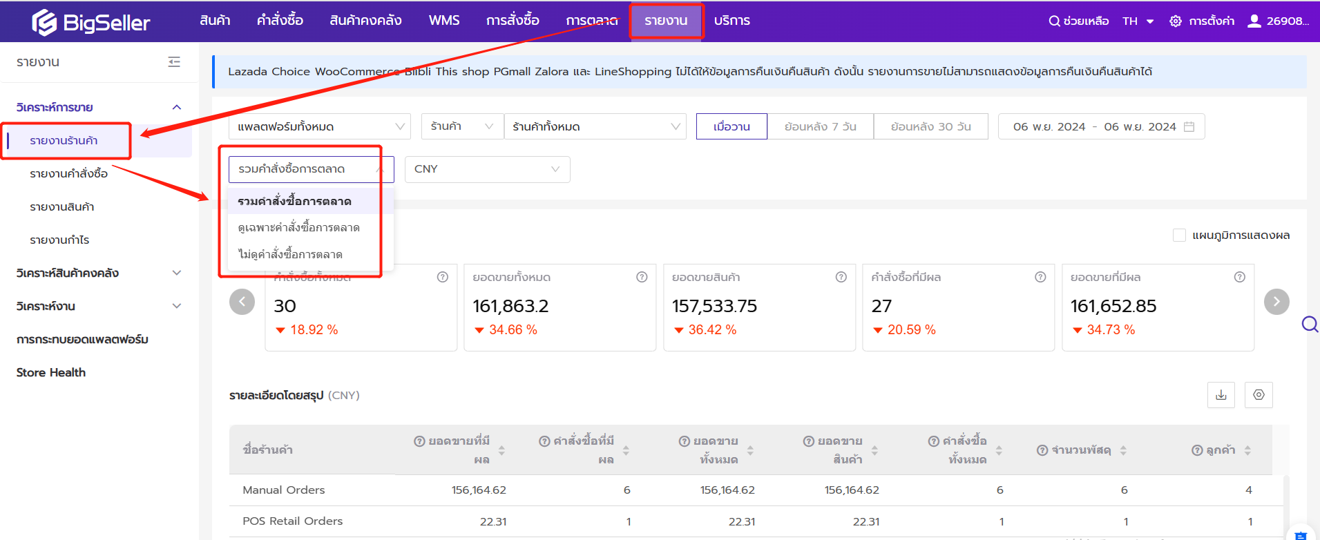 ด้วยความพิเศษของคำสั่งซื้อการตลาด ผู้ขายบางครั้งต้องการคัดกรองคำสั่งซื้อประเภทนี้ออกมา เพื่อให้คำควณกำไรคำสั่งซื้อให้แม่นยำ BigSeller รองรับเช็กดูกำไรของคำสั่งซื้อการตลาดในรายการวิเคราะห์การขาย เพิ่มความแม่นยำและประสิทธิภาพกับกำดำเนินของผู้ขาย