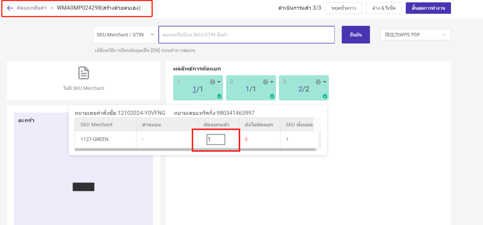 เมื่อสร้างเป็น Wave แล้ว พัสดุที่ถูกขนส่งจะถูกอัปเดตสถานะเป็น "จัดส่งแล้ว" โดยอัตโนมัติ พร้อมทั้งสามารถคัดแยกสินค้าด้วยตัวเองและระบุจำนวนที่คัดแยกได้อย่างง่ายดาย