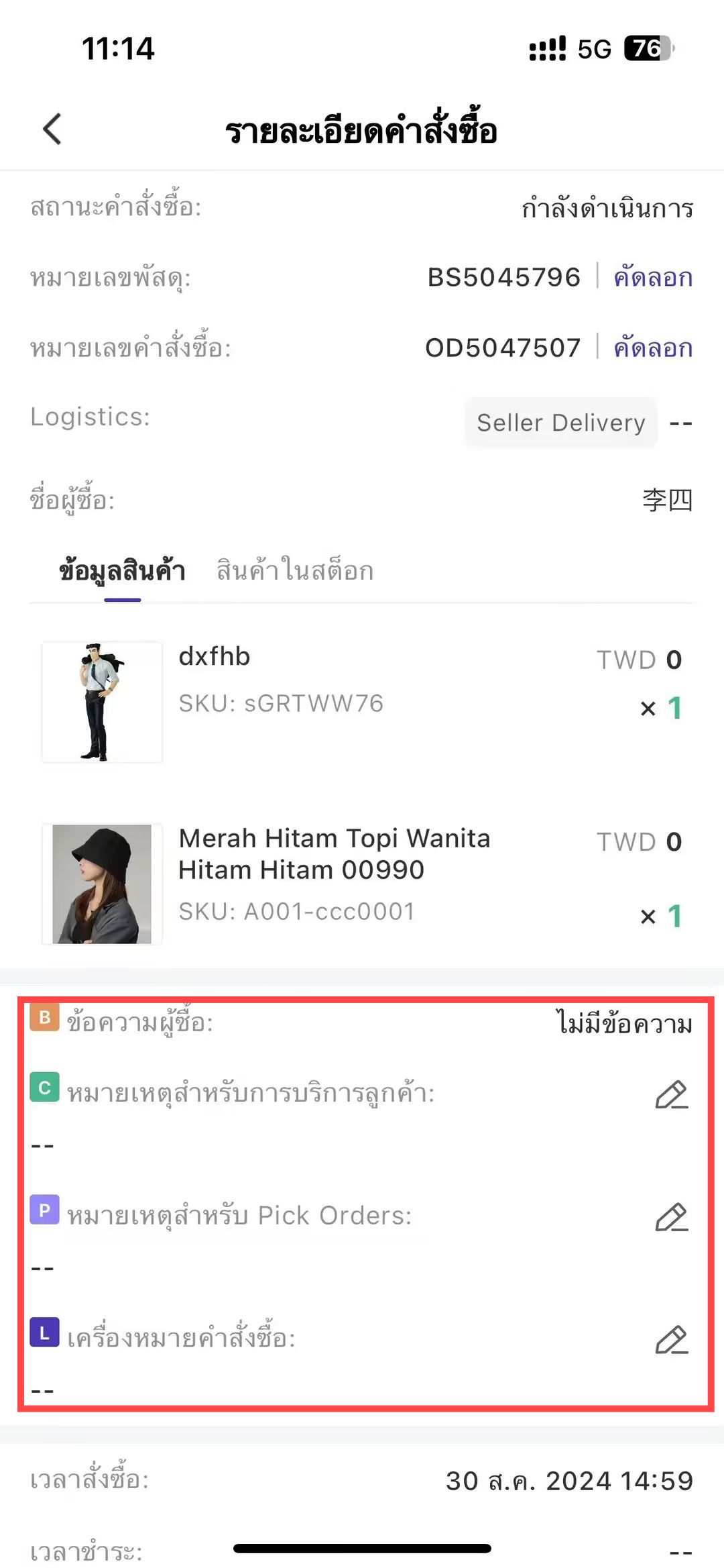 หมายเหตุสำหรับ Pick Orders และเครื่องหมายคำสั่งซื้อ : คุณสามารถเพิ่มหมายเหตุและเครื่องหมายในคำสั่งซื้อได้โดยตรงผ่านแอป BigSeller โดยไม่ต้องใช้คอมพิวเตอร์ ช่วยเพิ่มประสิทธิภาพในการทำงานได้มากขึ้น