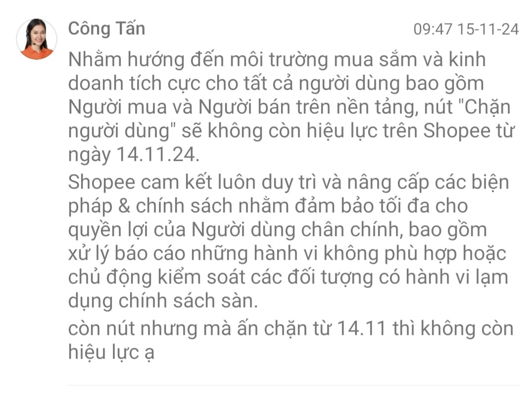 Các nhà bán hàng chú ý, bắt đầu từ 14.11. 2024 nút "Chặn người dùng" sẽ không còn hiệu lực trên Shopee.